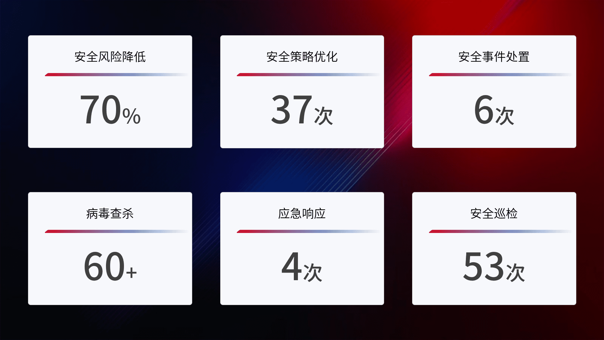 提供全面的安全事件报告体系,,包括处置报告、、、周报、、、、季度和年度总结,,,,结合持续监控,,,帮助客户深入了解网络安全状况。。。